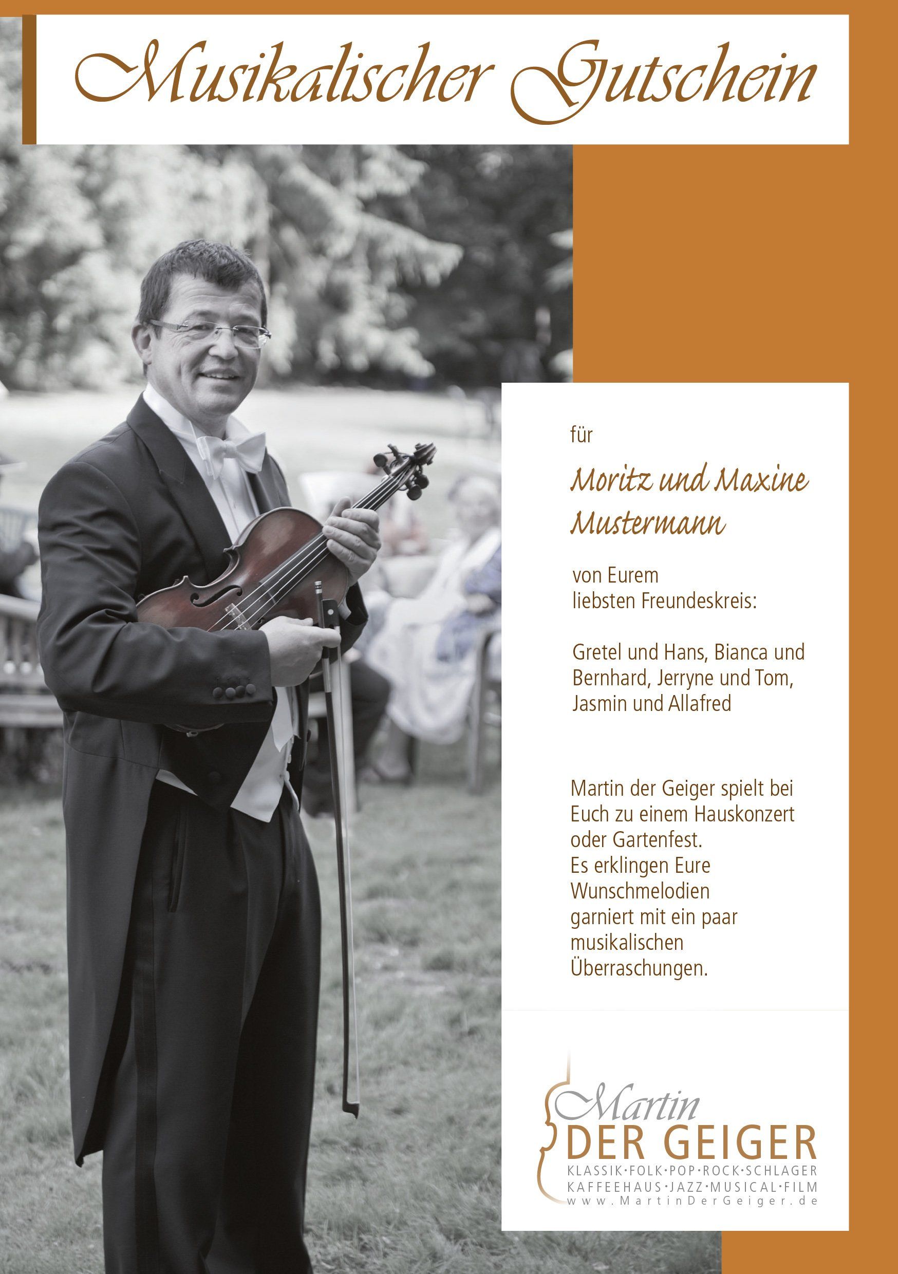 Ich freue mich, dass Sie nach Live-Musik suchen. Martin der Geiger spielt die schönsten Melodien zu Hochzeit, Empfang, Veranstaltung, Vernissage, Soiree, Tanztee, Gartenfest, Weihnachtsfeier, Sommerfest, Event, Trauerfeier, Beerdigung etc..