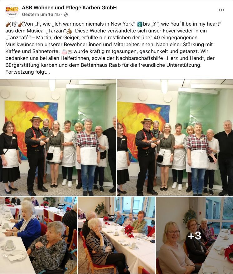 Erneut gibt es Wunschkonzerte in den beiden Karbener Seniorenheimen. Diesmal natürlich mit ein paar Weihnachtlichen Melodien gemischt . Die Konzerte werden durch Co-sponsoring finanziert. Vielen Dank an die Bürgerstiftung, Zeit fürs Bett und Herz und Hand Nacbarschaftshilfe Karben